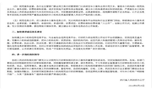 ?。ㄎ澹┮?guī)范信息公開。深入推進(jìn)中介服務(wù)信息公開,充分利用政務(wù)服務(wù)平臺網(wǎng)站和行業(yè)主管部門網(wǎng)站,積極推動(dòng)中介服務(wù)項(xiàng)目名稱、法律依據(jù)、辦事程序、申報(bào)材料、承諾時(shí)限、收費(fèi)項(xiàng)目、收費(fèi)標(biāo)準(zhǔn)和收費(fèi)依據(jù)“八公開”。創(chuàng)新公開方式,拓展公開渠道,充分發(fā)揮政務(wù)微博、微信等新興媒體作用,建立健全中介服務(wù)信息動(dòng)態(tài)公開制度。