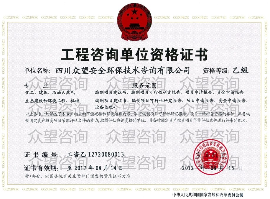 本公司于2012年取得工程咨詢乙級資質(zhì),現(xiàn)有注冊咨詢工程師23人,可以從事化工、建筑、機(jī)械、石油天然氣、生態(tài)建設(shè)和環(huán)境工程5個行業(yè)的節(jié)能評估、可行性研究報告、項目申請報告、資金申請報告編制工作。近兩年,