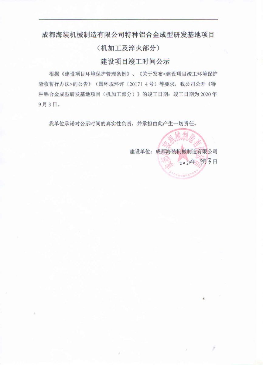 根據(jù)《建設項目環(huán)境保護管理條例》、《關于發(fā)布<建設項目竣工環(huán)境保護驗收暫行辦法>的公告》(國環(huán)規(guī)環(huán)評〔2017〕4號)等要求,我公司公開《特種鋁合金成型研發(fā)基地項目(機加工部分)》的竣工日期:竣工日期為2020年9月3日。
